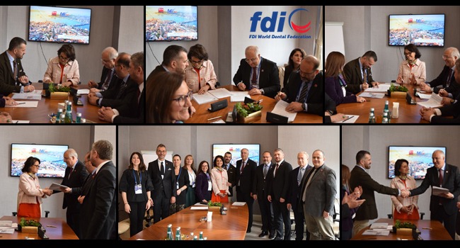 12-15 Eylül 2024 tarihlerinde Lütfi Kırdar ve ICC Kongre Merkezlerinde yapılması kararlaştırılan FDI Kongresi ayrıntıları için 24-25 Nisan 2023 tarihlerinde heyetler arası yapılan görüşmelerden sonra hazırlanan protokol, 29 Nisan 2023 tarihinde (bugün); FDI adına FDI Başkanı Prof. Ihsane Ben Yahya ve İdare Müdürü Enzo Bondioni ile TDB adına TDB Genel Başkanı A.Tarık İşmen ve Genel Saymanı Umut Barış Baykara tarafından imzalandı. İmza töreninde; TDB Genel Başkanvekili Burak Saran, Genel Sekreteri Emel Eroğlu, Merkez Yönetim Kurulu Üyesi A.Selhan Kaya ve TDB Dış İlişkiler Komisyonu Üyeleri hazır bulundu.